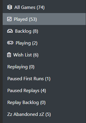 You can also have the same game on multiple shelves, so my three Replay-related shelves are all games that also appear on my Played shelf, but I’m either replaying it, planning to replay it soon (Replay Backlog is where I stick games that have a new content update or DLC so I don’t forget to check it out when I have a chance), or I started replaying and took a break from but still intend to finish…at some point, eventually.