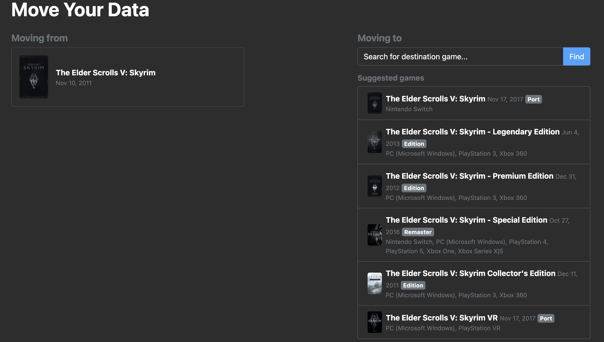There are buttons on both versions of the game page. It’s much more prominent on the Giant Bomb game pages. Right under where it says My Data, there is a button that says Move data to another game. On the IGDB pages, it’s towards the bottom of the user data area, above the “Related Content” area or above user reviews on pages that don’t have related content.
