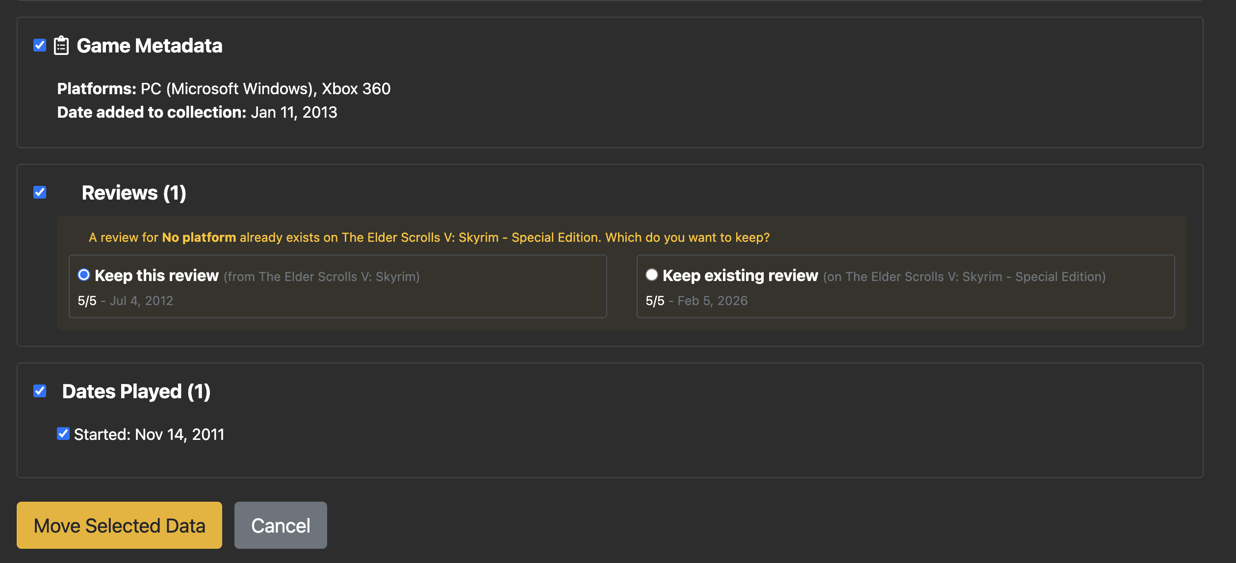 It will allow you to select what shelf entries you want to move, dates played, reviews (also resolves review conflicts if there are existing reviews on both), etc. I think I’ll probably make this live for everyone this weekend. Seems to work pretty well so far.